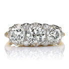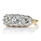 The Arabella ring is an authentic vintage diamond ring from the Edwardian Era circa 1915. The ring features an approximately 1.10-carat Old European Cut diamond of approximately J-K color, VS-SI clarity with an Old European Cut of coordinating color and clarity to each side. The side stones combine for approximately 1.20-carats. Four small old mine cut diamonds are set between the larger stones combining for roughly 0.05-carats. The stones are set in a 22kt yellow gold and 22kt white gold setting. The ring is currently size 5.75 and can be resized!