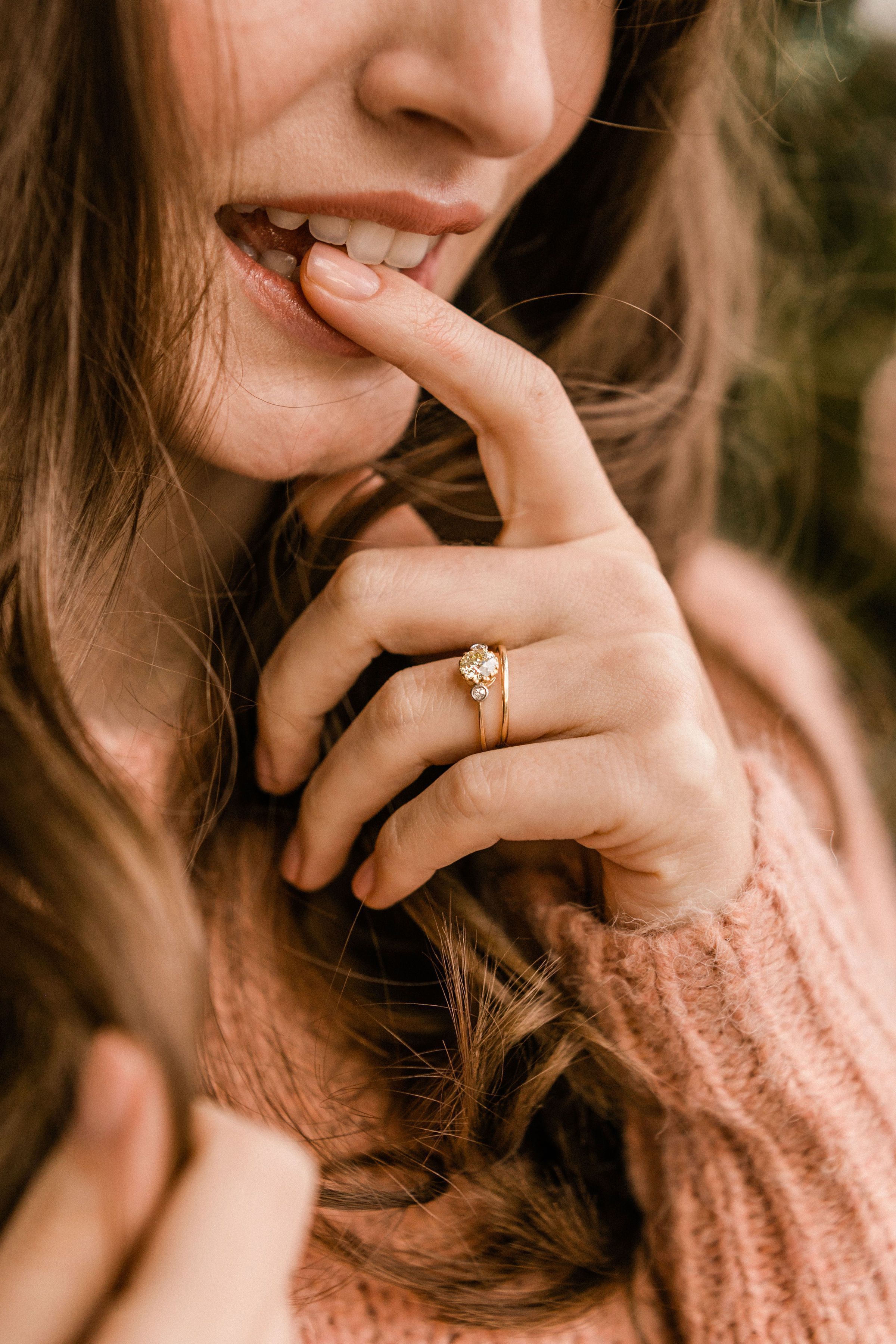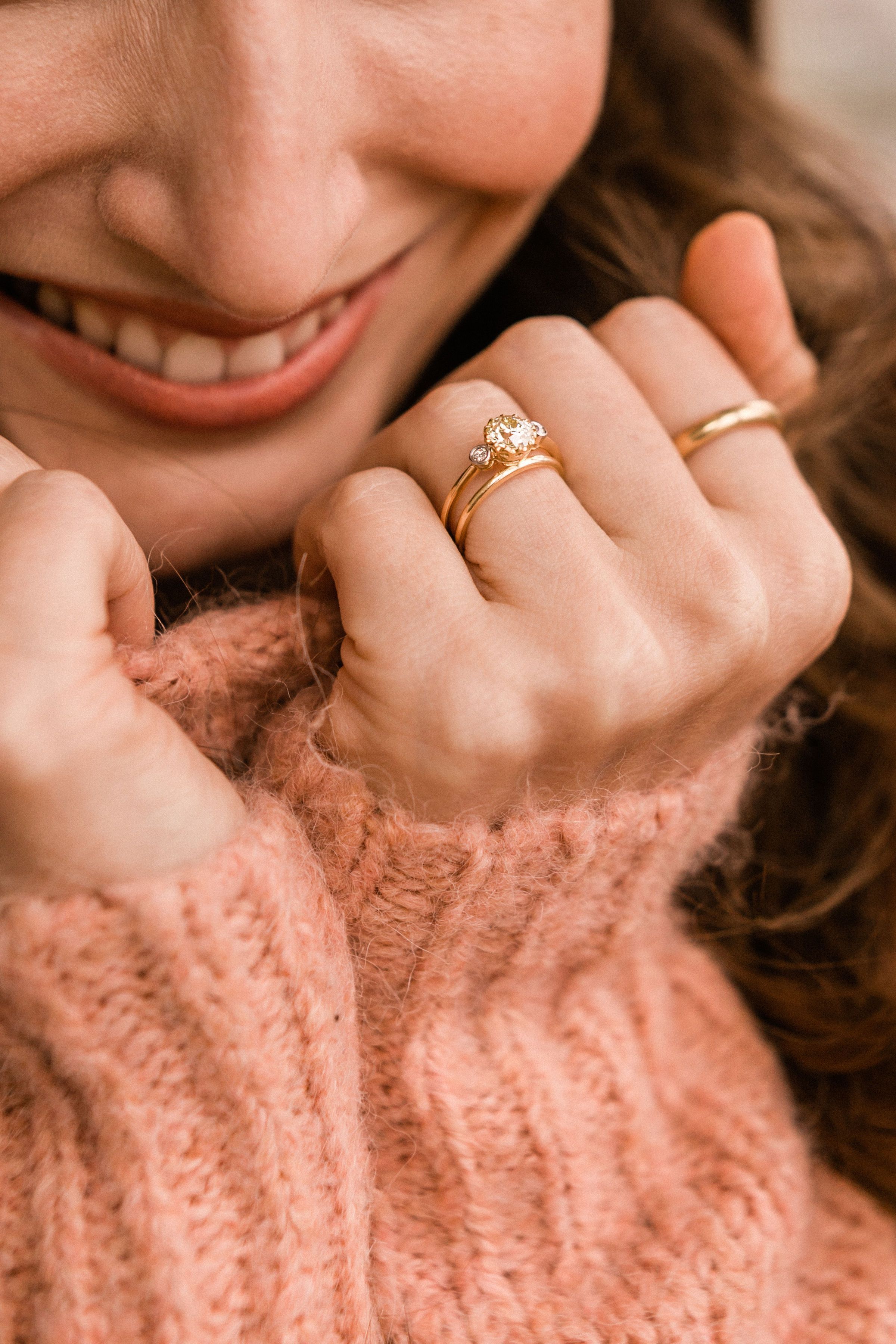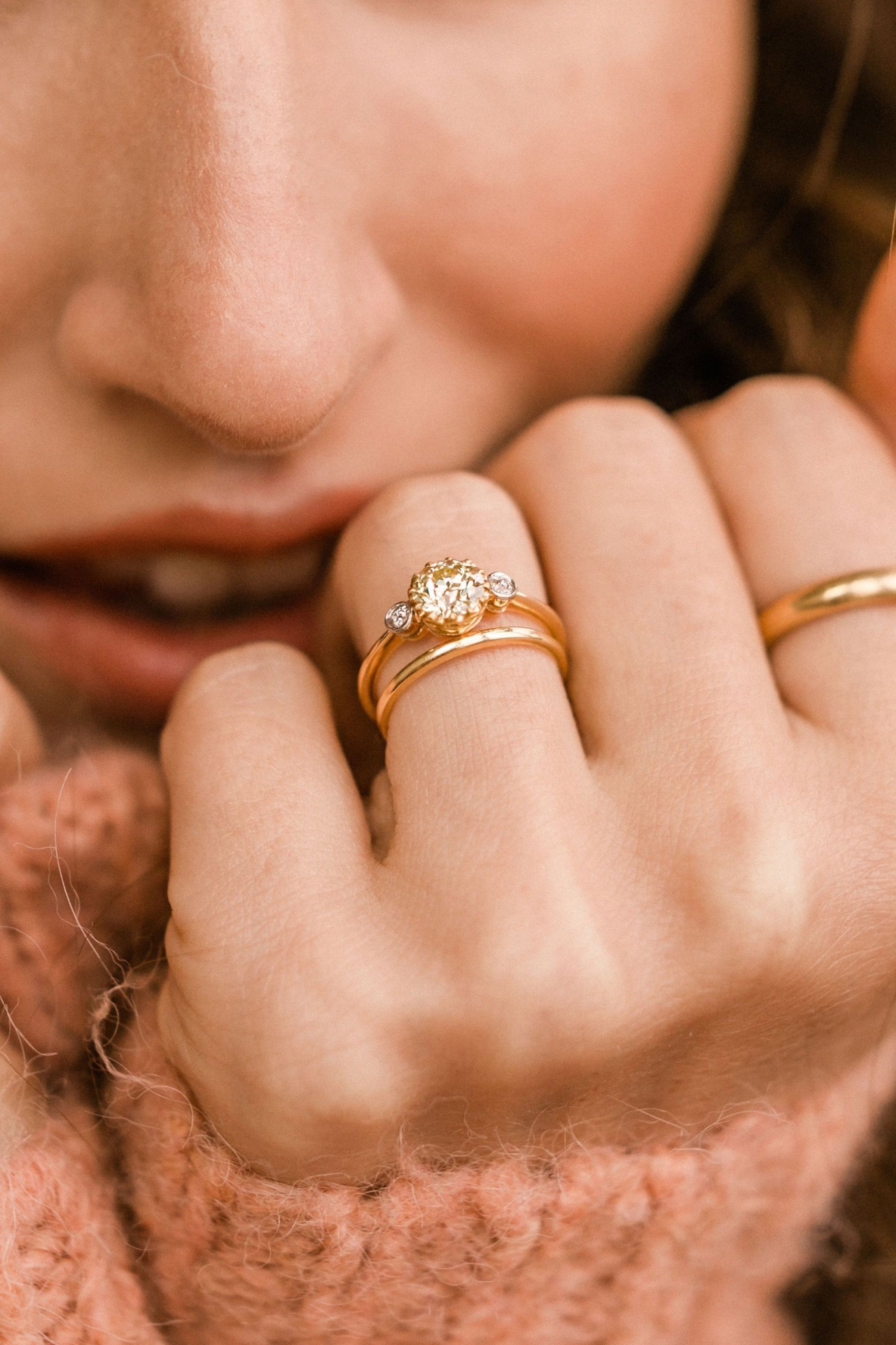 The Lara 0.87 Ring is a VB-made Vintage-Inspired engagement ring! This W-X color diamond engagement ring centers an authentically antique GIA Certified 0.87 carat old European cut diamond of W-X color, VS2 clarity. The diamond is prong-set in an 18kt yellow gold setting with a small old European cut diamond to each side that is bezel-set in platinum, both combining for 0.10 carats. The ring is size 5.5 and can be resized!