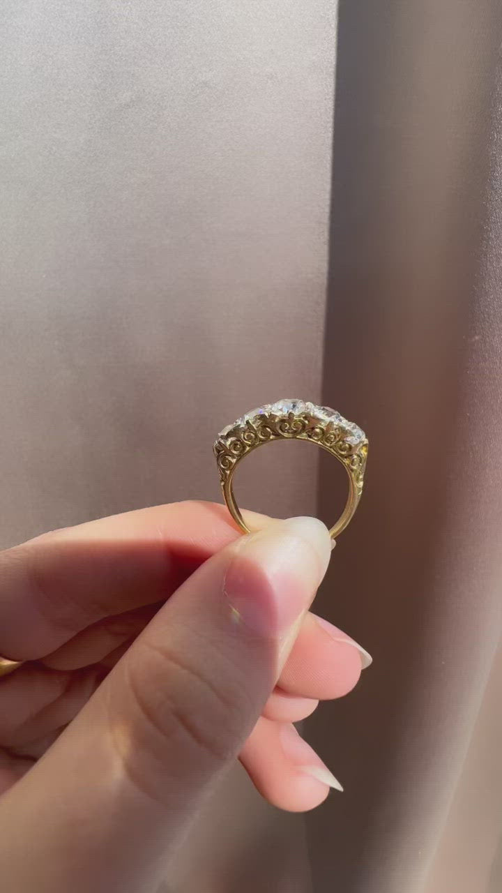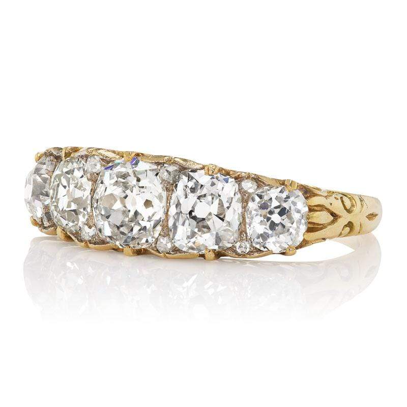 The Wembley ring is an authentic vintage diamond ring from the Late Victorian Era circa 1890. The ring features 5 old mine cut diamonds of approximately H-I-J color, VS clarity (with some SI) that combine for approximately 2.65 carats. Eight small rose cut diamonds are set between the diamonds. The stones are set in an 18 karat yellow gold setting. The ring is currently size 7.25 and can be resized!