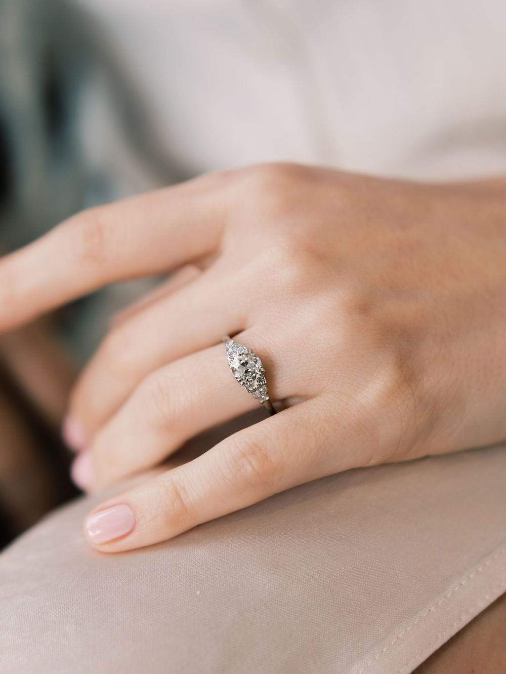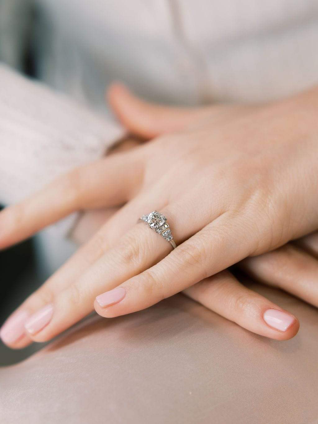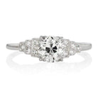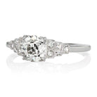 The Nola ring is a vintage engagement ring from the Art Deco Era. The ring centers a GIA certified 1.17-carat old European cut diamond of J color, VS1 clarity. The stone is set in an 18kt white gold setting. Five small diamonds are set into each of the shoulders of the ring. The ring is currently size 8.25 and can be resized!