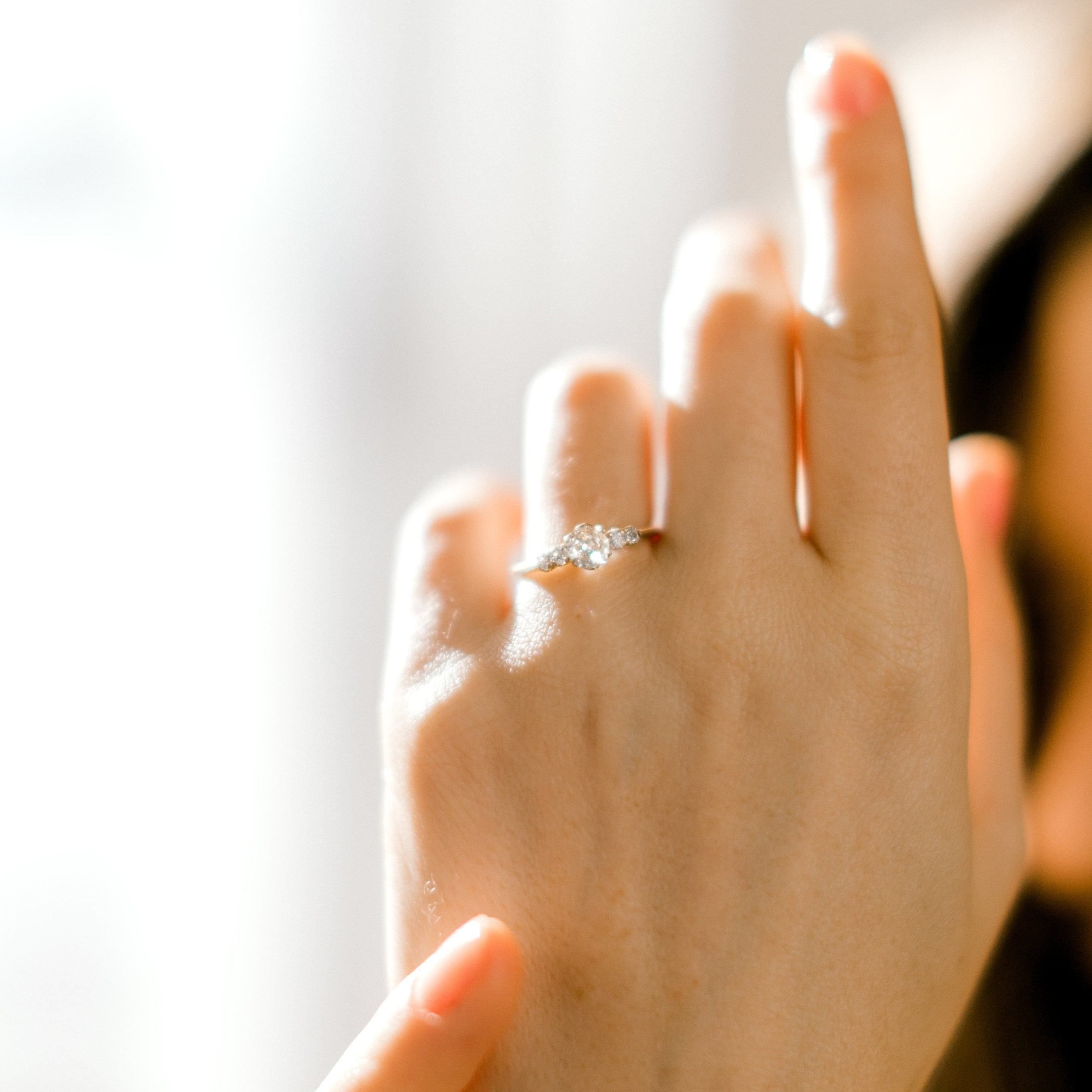 This ring has a unique take on classic elegance! We love the functional low-profile setting of the gorgeous old cut diamonds paired with a lovely dainty gold band!
