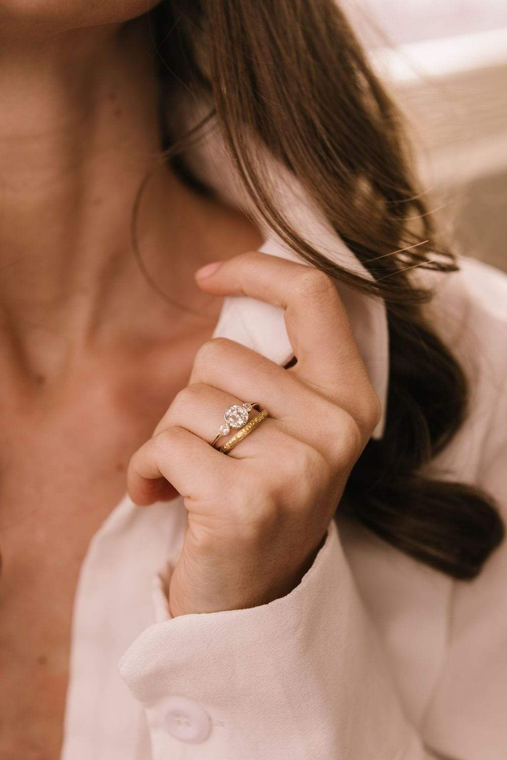 A beautiful piece with a sleek and clean style! The ring is super low profile with vibrant diamonds! The gallery of the ring has light and airy filigree details and the shank adds a little something extra!