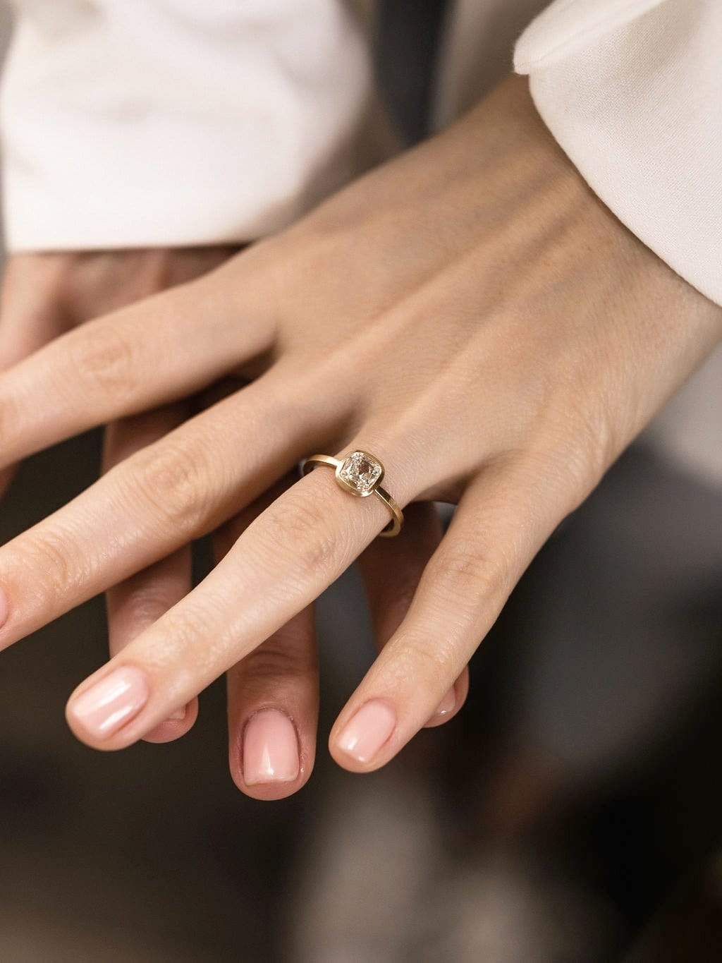 The Cabernet 0.94 ring is a VB-made engagement ring with an antique diamond! This 18Kt Yellow Gold Bezel Set Solitaire Engagement Ring centers a GIA certified 0.94 carat old mine cut diamond of H color, VS2 clarity. The diamond is bezel-set in an 18kt yellow gold setting with a partially closed back. The ring is currently size 6.75 and can be resized!