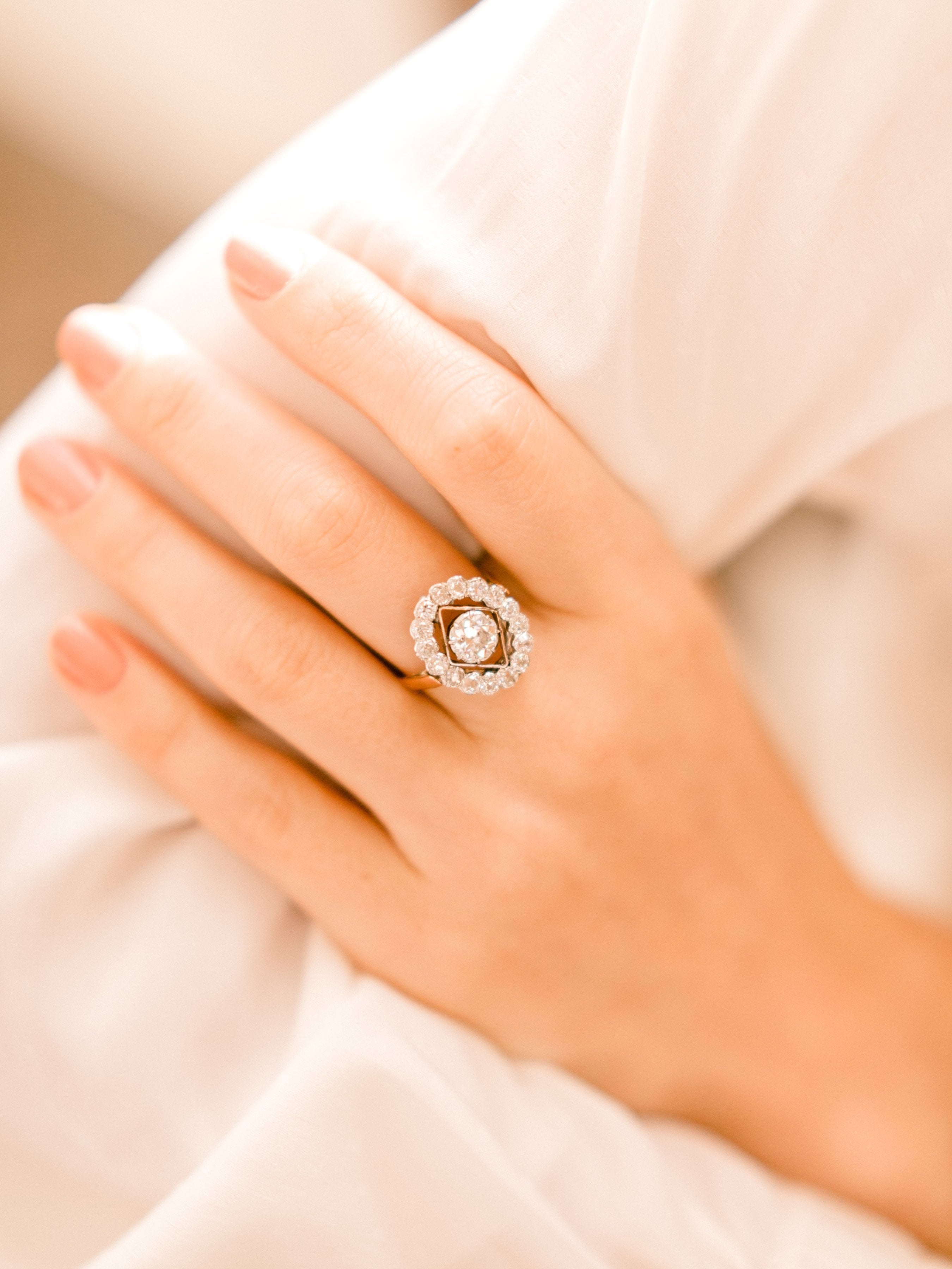 This one is amazing! We love the oval shape that really looks amazing on the finger! The diamond shape of the metal in the center adds a chic element to this gorgeous halo style ring!