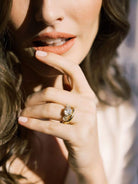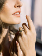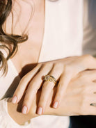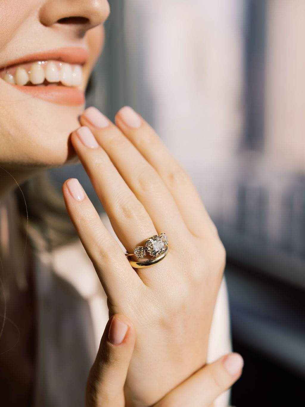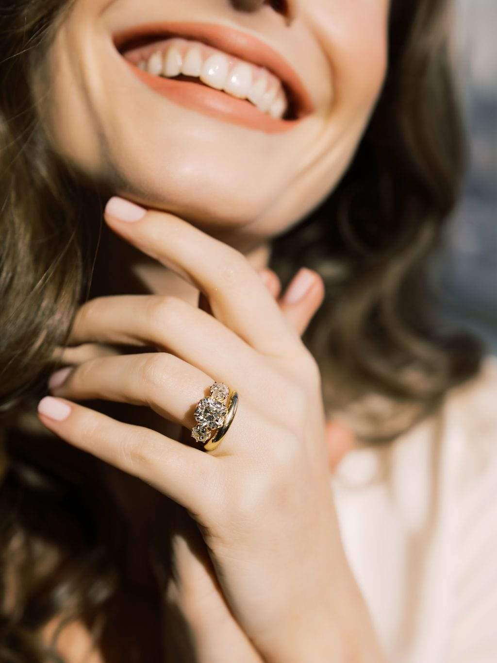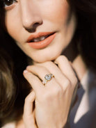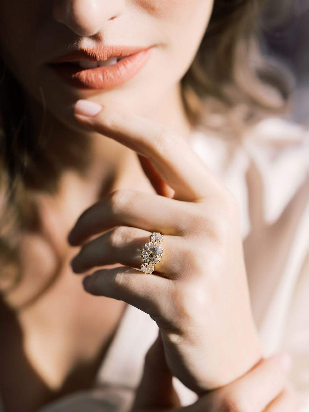 The Marielle 3.19 ring is a VB-made diamond engagement ring. The ring centers a GIA certified 3.19-carat old mine cut diamond of O-P color, SI1 clarity. The stone is set in a 12-prong 18kt yellow gold setting. To each side of the center stone is an old mine cut diamond, both combining for 1.43 carats. The ring is currently size 6 and can be resized!
