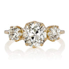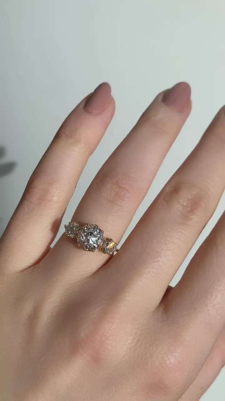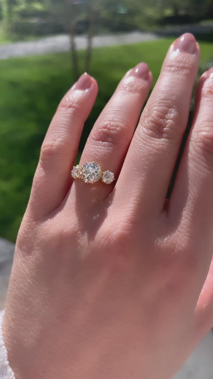 The Marielle 2.03 ring is a VB original design made right here in NYC using authentically antique diamonds. The ring centers a GIA certified 2.03-carat old mine cut diamond of J color, SI2 clarity. The stone is set in an 18 karat yellow gold setting. The side stones are gorgeous old mine cut diamonds and combine for 0.78 carats. The ring is currently size 6.25 and can be resized.
