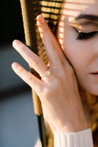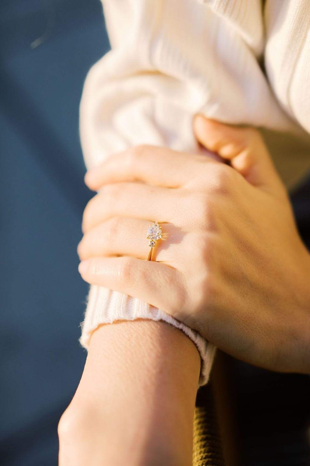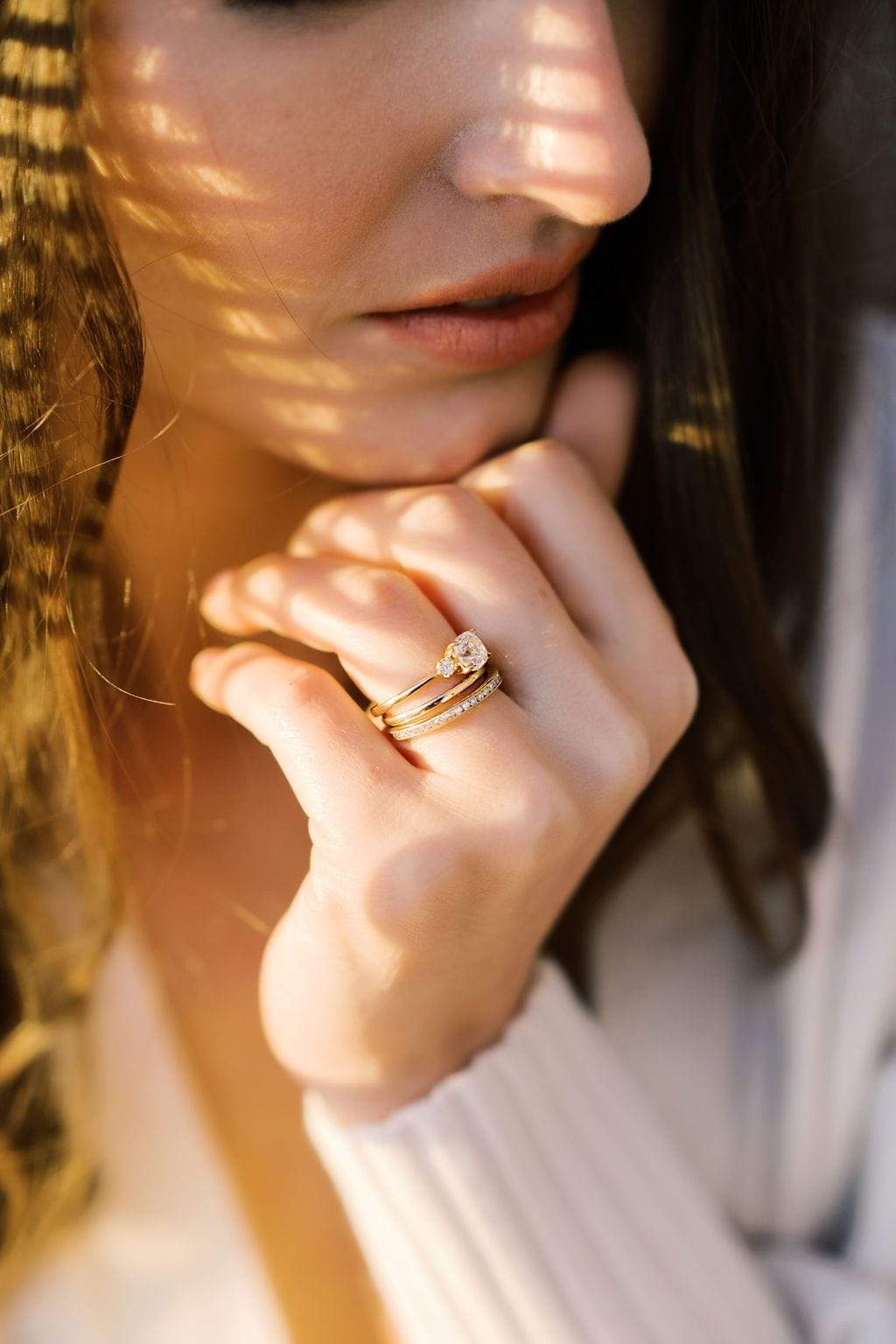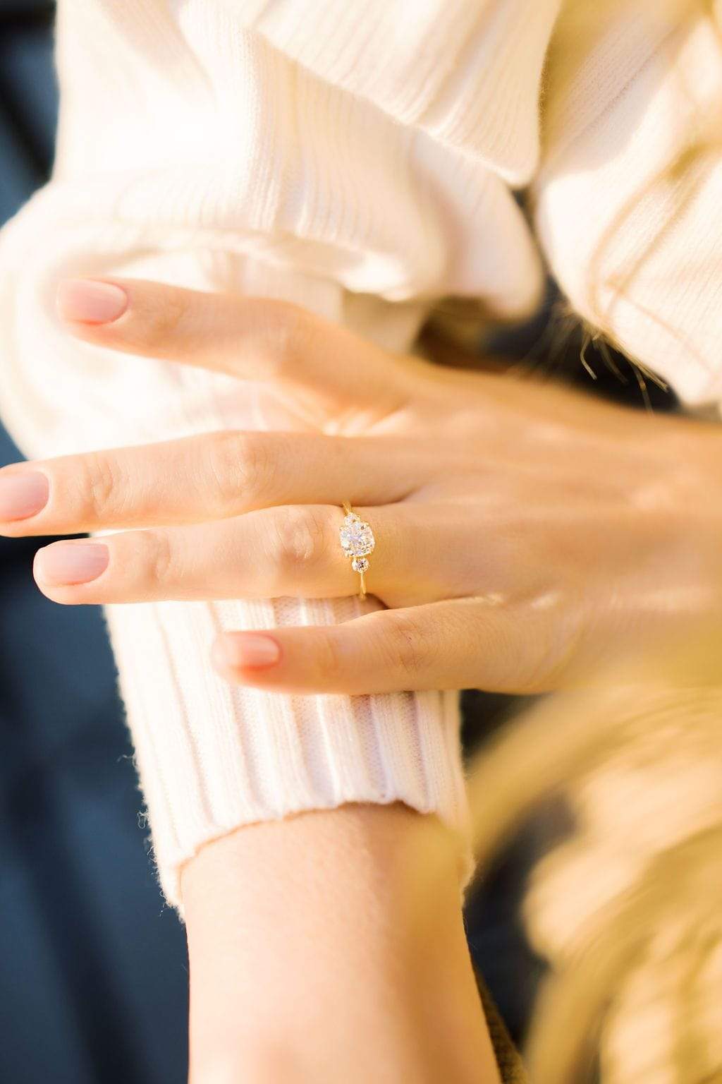 We are big three stone fans and this three stone ring is a delicate beauty. It has a definite center stone with more petite side stones to accentuate the center diamond.