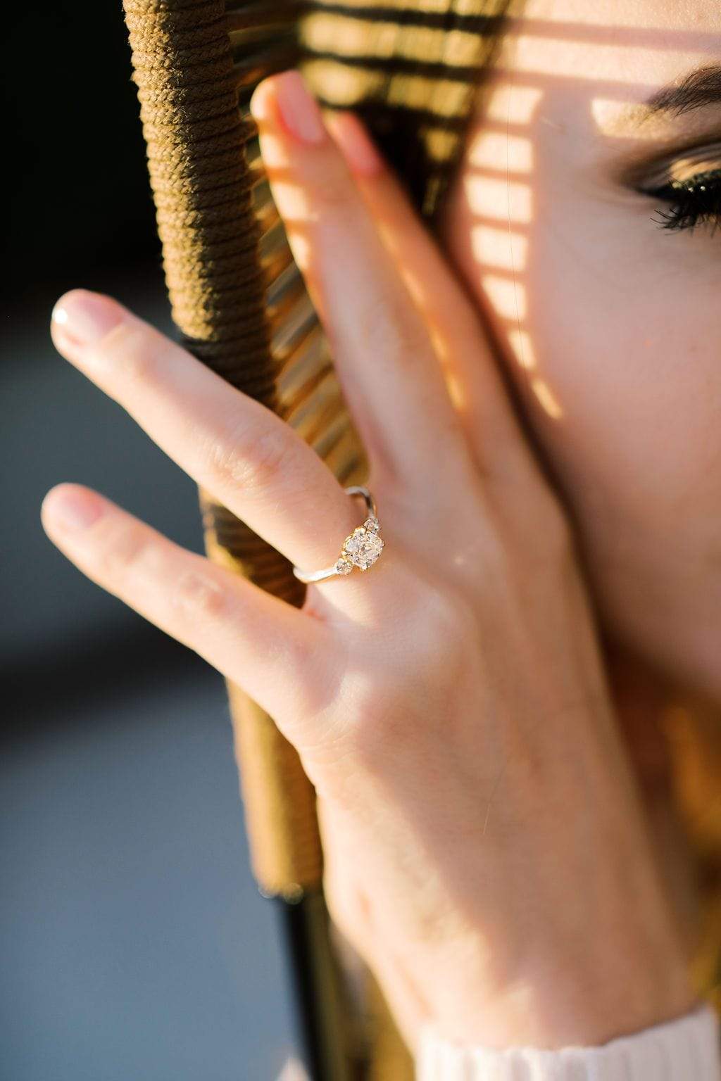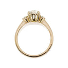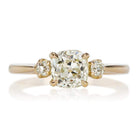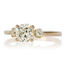 The Daffodil 1.13 ring is a vintage-inspired VB-made diamond engagement ring. The ring centers a GIA certified 1.13-carat old mine cut diamond of M color, SI2 clarity. The diamond is set in a 4-prong 18 karat yellow gold setting. To each side of the center stone is an old European cut diamond, both combining for approximately 0.10 carats. The ring is currently size 6 and can be resized.