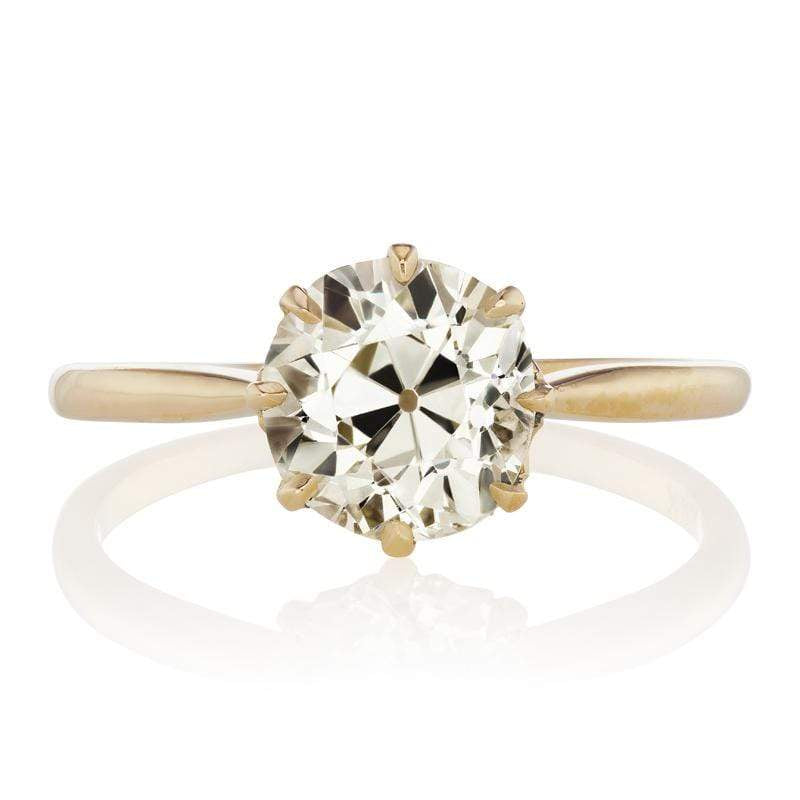 The Zara 2.02 ring is a VB original design made right here in NYC. The ring centers a GIA-certified 2.02-carat old mine cut diamond of Q-R color, VS1 clarity. The stone is set in an 8-prong 18 karat yellow gold setting with a slightly tapered band. The ring is currently size 6.5 and can be resized!
