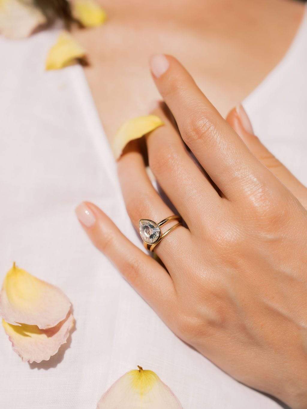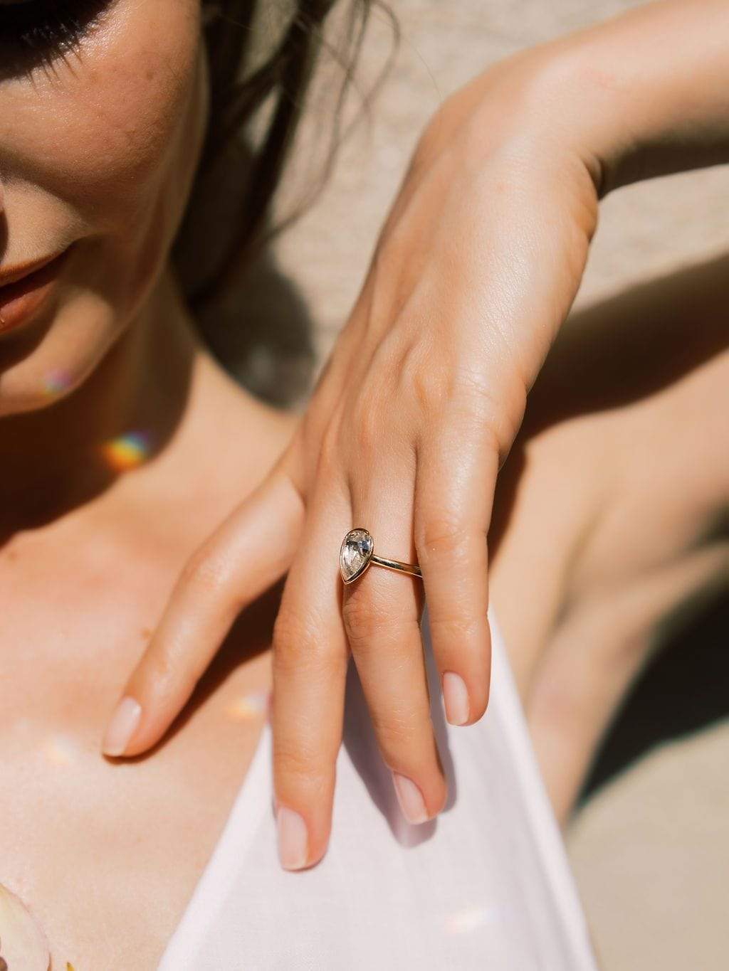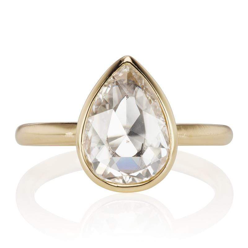 The Zinfandel 1.78 ring is a vintage-inspired VB-made diamond engagement ring centering a diamond from the Georgian Era. The ring centers a GIA certified 1.78 carat Pear Shaped Rose cut diamond of G color, SI2 clarity. The diamond is bezel set in an 18kt yellow gold setting with a partially closed back. The ring is currently size 6 and can be resized!